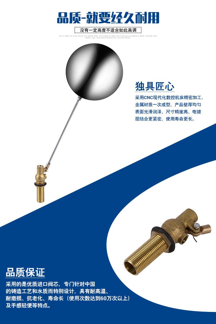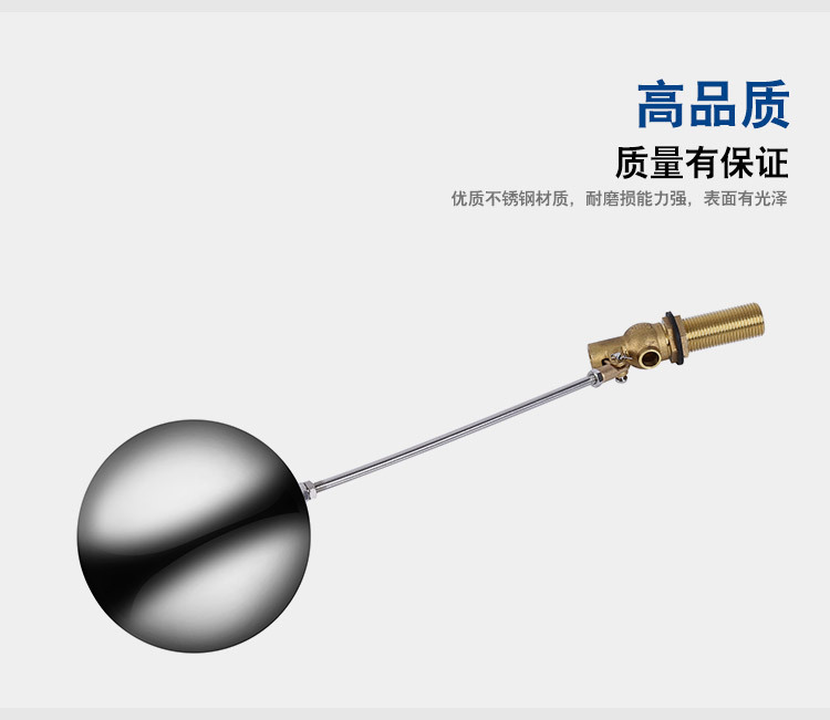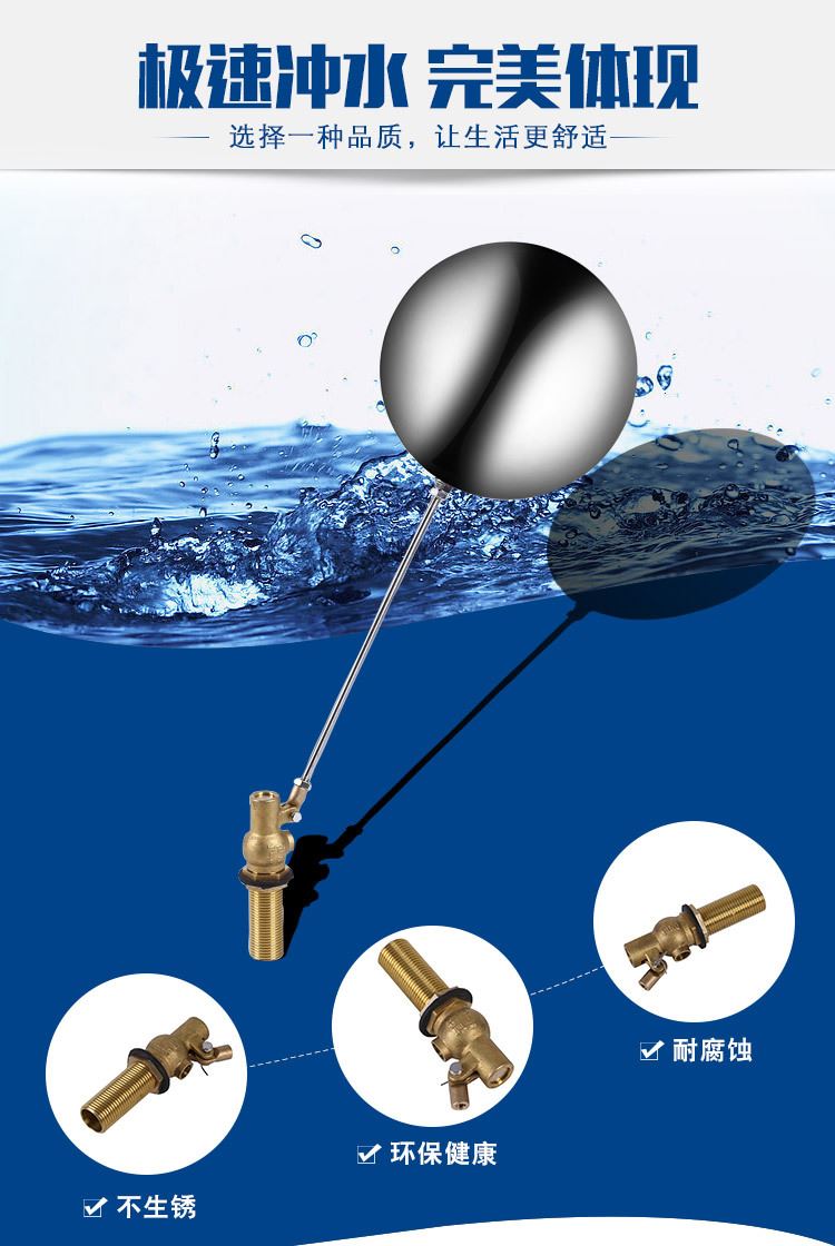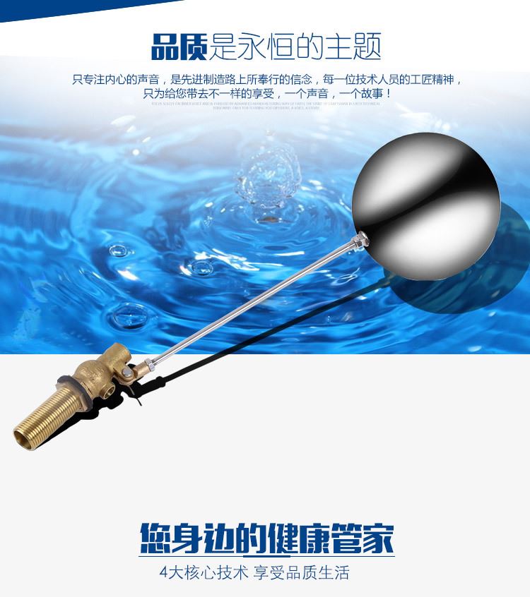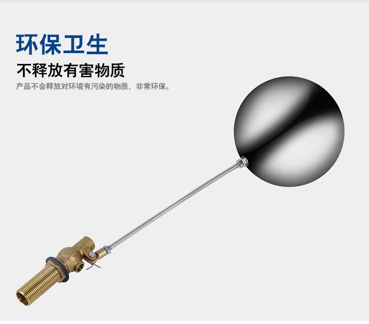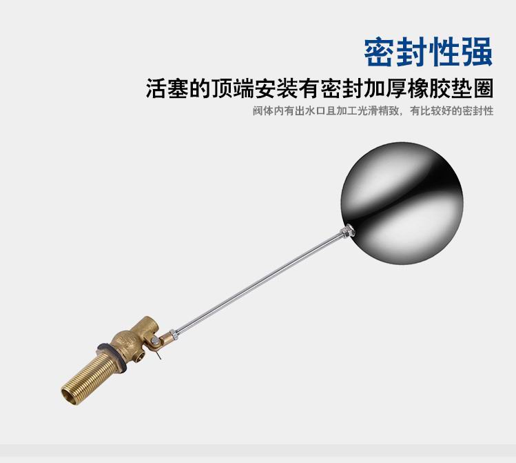 當(dāng)水塔內(nèi)水面下降時(shí),浮球下落,利用水管內(nèi)水的壓力,將閥體里的密封硅膠柱塞打開,閥體開啟供水,當(dāng)水塔水位上升時(shí),浮球上浮,連桿帶動(dòng)柱塞,硅膠體密封進(jìn)水孔,閥體停止供水.