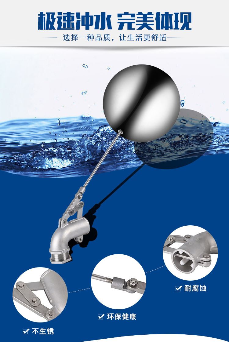 當水塔內(nèi)水面下降時,浮球下落,利用水管內(nèi)水的壓力,將閥體里的密封硅膠柱塞打開,閥體開啟供水,當水塔水位上升時,浮球上浮,連桿帶動柱塞,硅膠體密封進水孔,閥體停止供水.