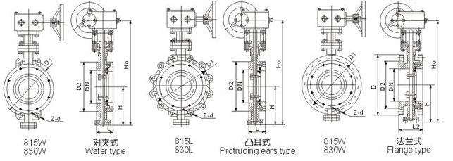 本產(chǎn)品815、830系列蝶閥的主要結(jié)構(gòu)特征為對夾式和法蘭式三偏心結(jié)構(gòu),而815、830L系列蝶閥的主要結(jié)構(gòu)特征為閥體周邊帶凸耳且設計成帶螺孔單法蘭結(jié)構(gòu)。815、830系列蝶閥廣泛應用于石油、化工及工業(yè)環(huán)保水處理、高層建筑、給排水等管道上。其特點為:由于采用的是三偏心結(jié)構(gòu),密閉性能可靠,確保開啟時蝶板不接觸密封座,消除了密封座不均勻負載,延長了使用壽命、確保可靠的密封性能,具有耐高溫、耐磨損、耐腐蝕等優(yōu)點。
