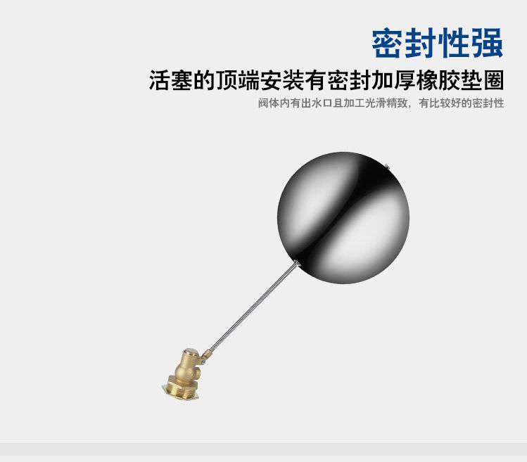 當(dāng)水塔內(nèi)水面下降時(shí),浮球下落,利用水管內(nèi)水的壓力,將閥體里的密封硅膠柱塞打開(kāi),閥體開(kāi)啟供水,當(dāng)水塔水位上升時(shí),浮球上浮,連桿帶動(dòng)柱塞,硅膠體密封進(jìn)水孔,閥體停止供水.